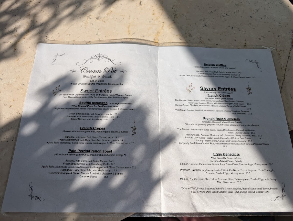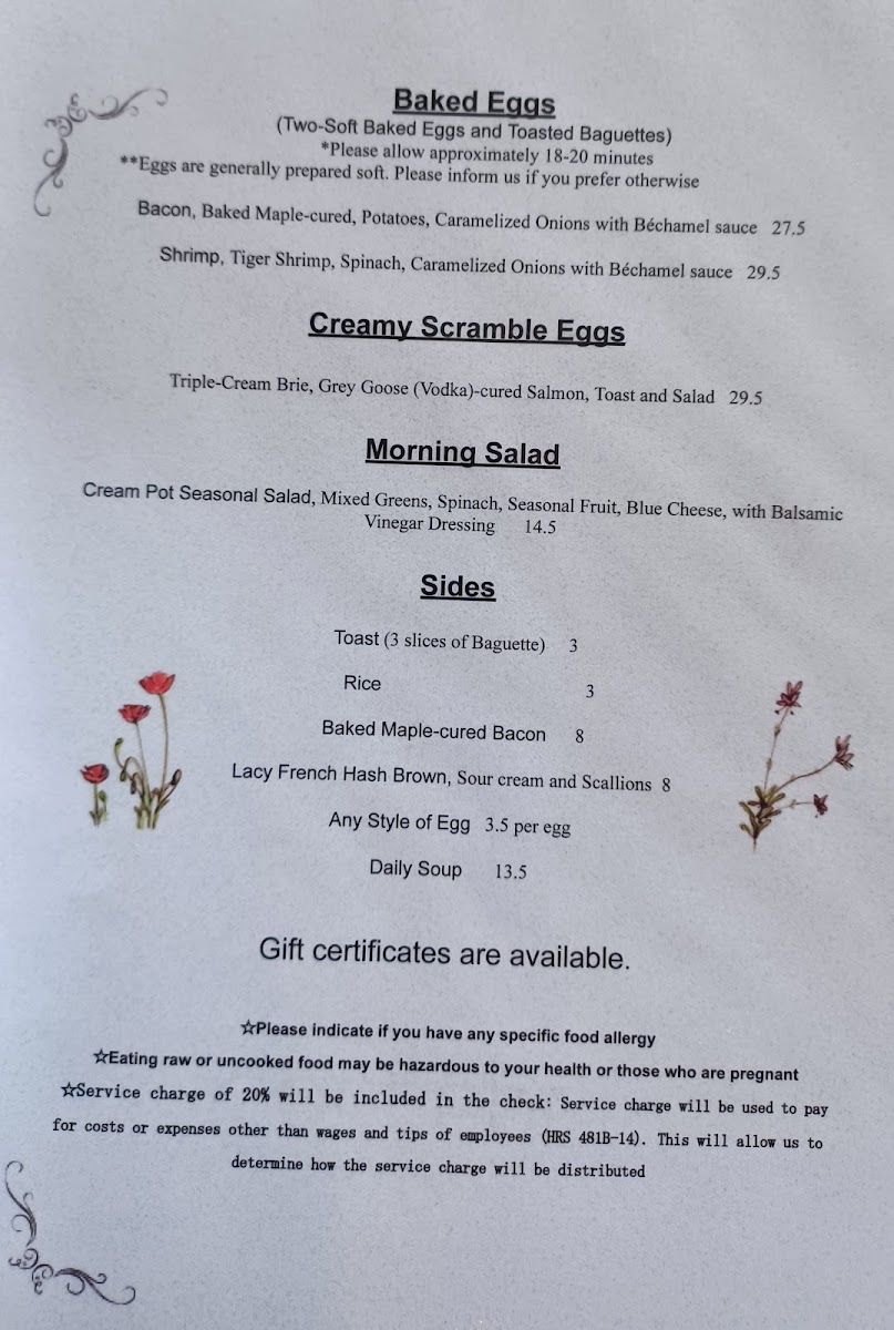Welcome to Cream Pot, a charming breakfast spot nestled in the heart of Honolulu at 444 Niu St. Here, mornings come alive with an enticing menu designed to tantalize your taste buds. One standout feature is their Baked Eggs, offering delectable combinations like Maple-Cured Bacon and Shrimp with béchamel sauce, priced from $17.50 to $20.50.